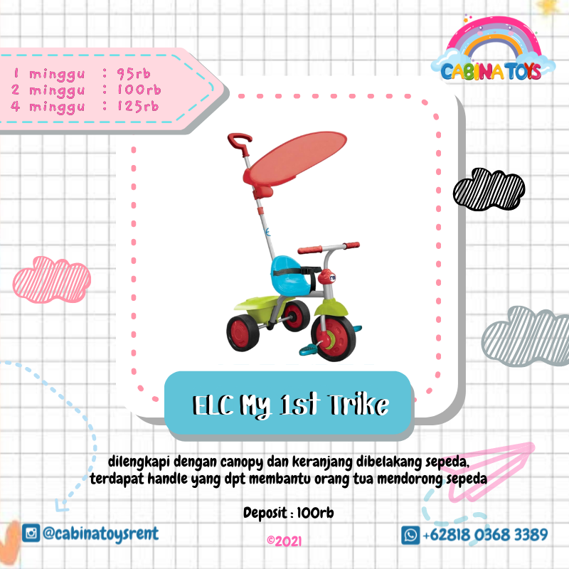 Sepeda Roda Tiga untuk anak 15-36 bulan merk Early Learning Center (ELC). Sepeda yang menarik karena memiliki warna yang cerah untuk anak-anak. Terdapat fitur hoodie, gagang kendali, dan juga keranjang yang bisa ditutup.