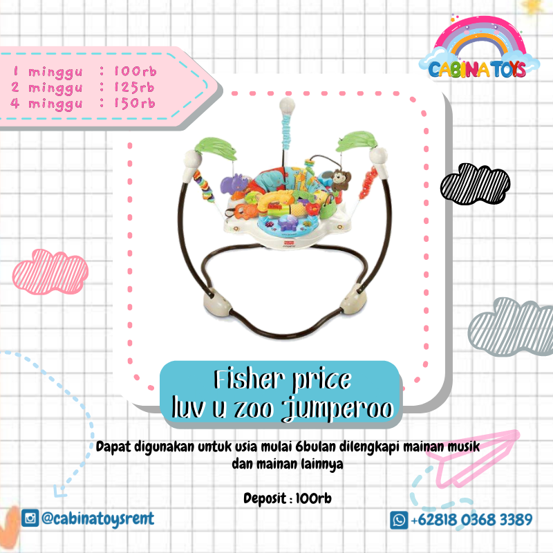 Fisher Price Luv U Zoo Jumperoo merupakan mainan yang dapat membuat anak anda melompat dengan aman meskipun belum bisa berjalan. Dilengkapi dengan mainan, lights, sounds dan music yang menyenangkan.